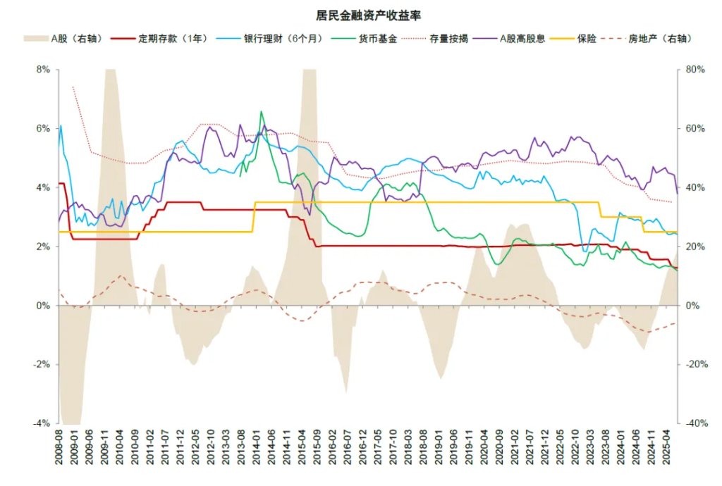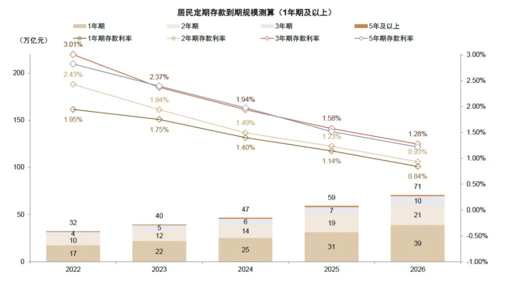 2. 进款到期视角:咱们使用上市银行的进款重订价数据估算恒久适度期进款在本年到期范畴。咱们估算2025年到期的1年期及以上住户如期进款范畴约为70万亿元,其中3年期如期进款到期范畴约7万亿元,这部分进款主要为2022年下半年股市资金回流和搭理回表产生,重订价后利率下跌约140个基点(3.0%到1.6%),到期后住户存在寻找其他高收益资产的能源。