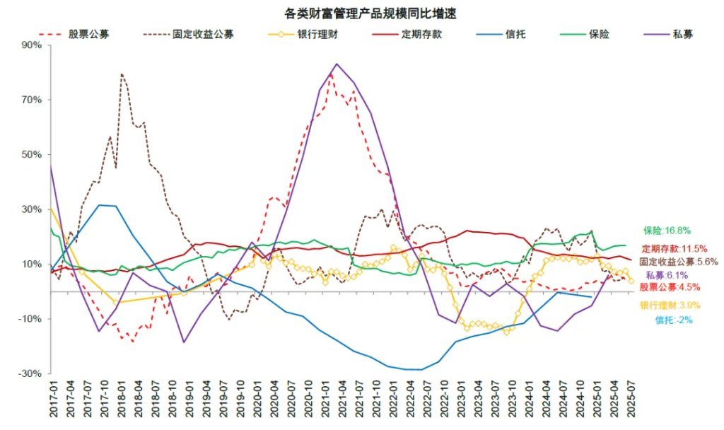 3. 金融脱媒的减轻。2023-2024年进款利率的下调、手工补息的算帐、同行进款的法度共同导致进款流向搭理、固收基金、保障等非银部门,变成了“金融脱媒”效应(参见咱们2024年6月的证明《银行:从“逾额储蓄”到金融脱媒》)。咱们左阐发体进款创造方式和现实净增范畴的各别估算2024年金融脱媒对实体进款的牵累约在12万亿元的范畴,而这一效应到2025年7月缩减为8万亿元(按照12个月滚动野心)。从固收类非银部门回流进款也成为本年进款增长回升的主要孝顺。