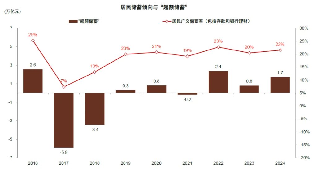 1. 逾额储蓄视角:当先咱们用住户近两年积聚的逾额储蓄范畴看成可能入市资金的测算。储蓄倾向为历史新增进款和银行搭理占可运用收入的比例,2016年-2024年平均约为20%。咱们测算2022年-2024年新增进款和银行搭理范畴约50万亿元,其中 “逾额储蓄”约为5万亿元,可能成为潜在用于消费、投资的资金。从历史训戒看,2016年“资产荒”中住户积聚逾额储蓄约3万亿元,2017年逾额储蓄蹧跶约6万亿元,主要插足房地产市集、股票市集和用于消费。